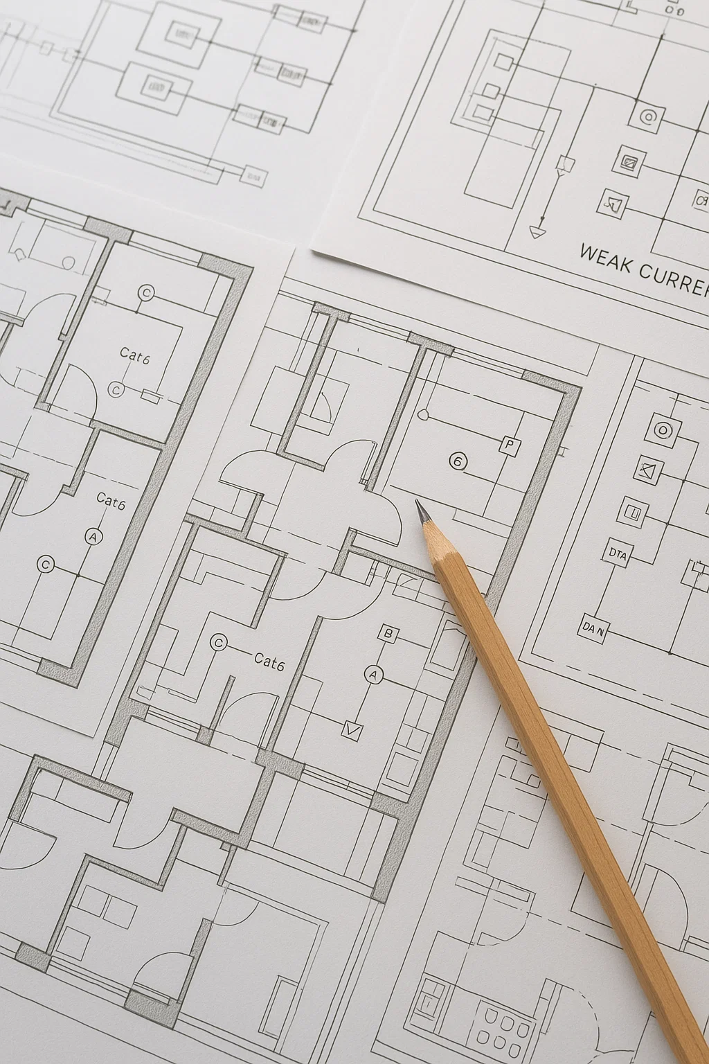 Zayıf akım sistemleri için profesyonel proje tasarımı ve uygulama (as-built) dokümantasyonu hizmeti sunuyoruz. Konsept yerleşimlerinden detaylı mühendislik çizimlerine kadar, her tasarımı projenizin teknik gereksinimlerine tam uyumlu, doğru ve standartlara uygun şekilde hazırlıyoruz.